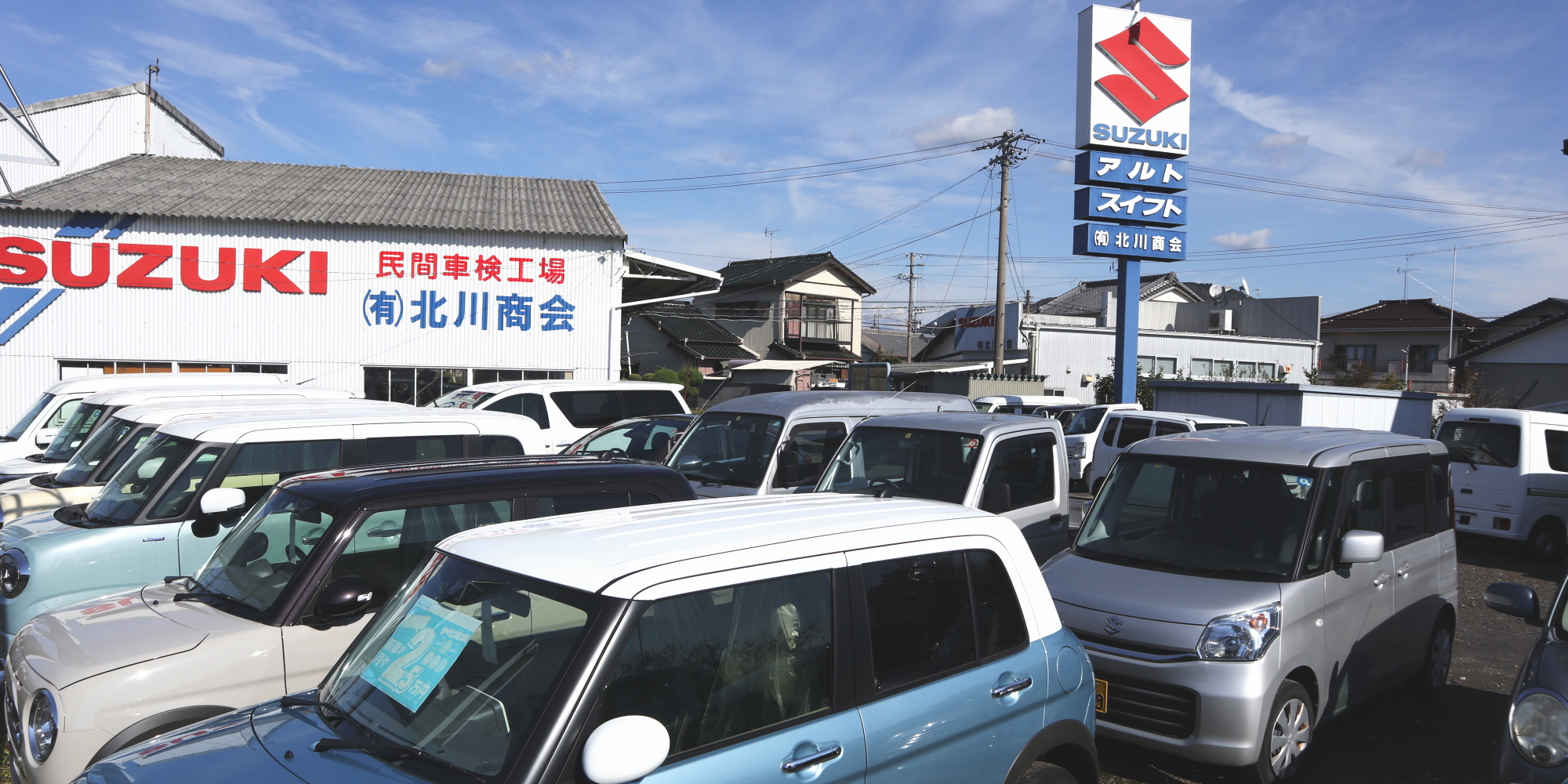 北川商会は、スズキの副代理店で、主にスズキ車の販売をしておりますが、 カーベル新車市場に加盟しており、スズキ以外の各国産メーカーのお車も取り扱いいたしております。新車購入時には、お客さまのご予算に合ったカーリースやローンをご紹介いたします。